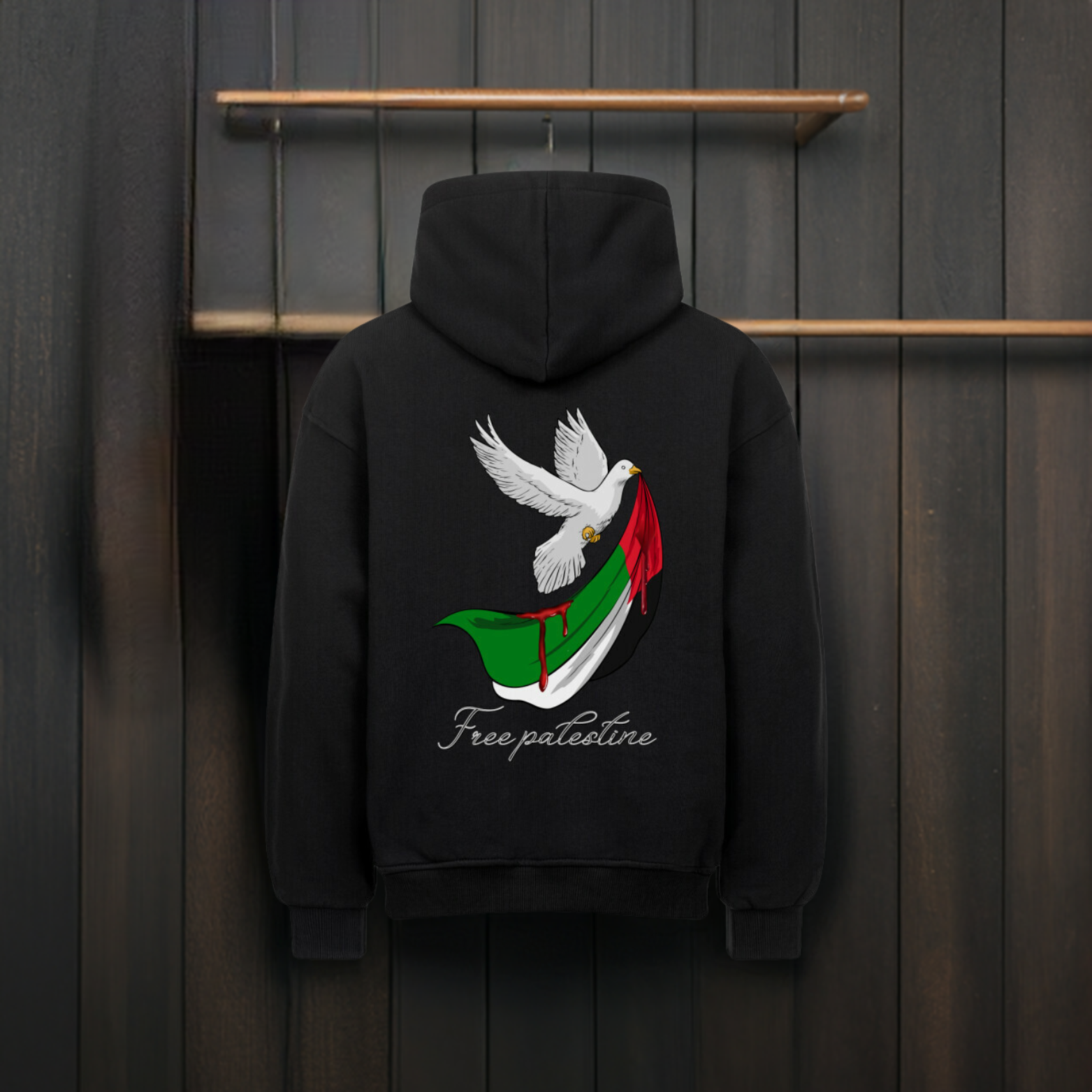 Yeni kalite standartlarını belirleyen, büyük kesimli, arkası Filistin baskılı, şık, ağır pamuklu birinci sınıf kapüşonlu üst.